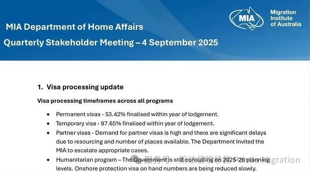 澳洲移民局(DHA/Department of Home Affairs)近日与MIA召开季度会议,公布了最新签证审理数据、配额使用情况及多项签证政策动态。为便于申请人和从业者更清晰把握移民趋势,我们整理了本次会议的核心内容: