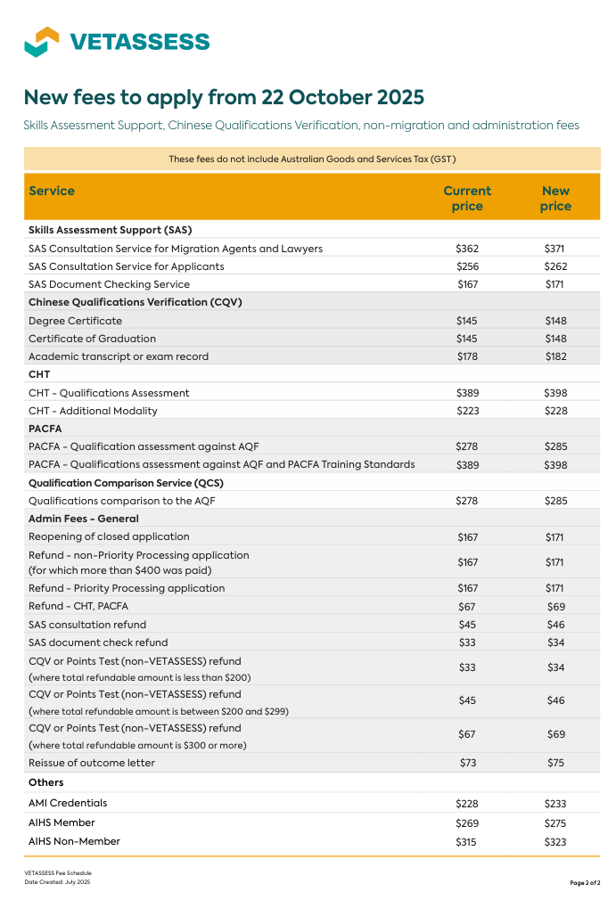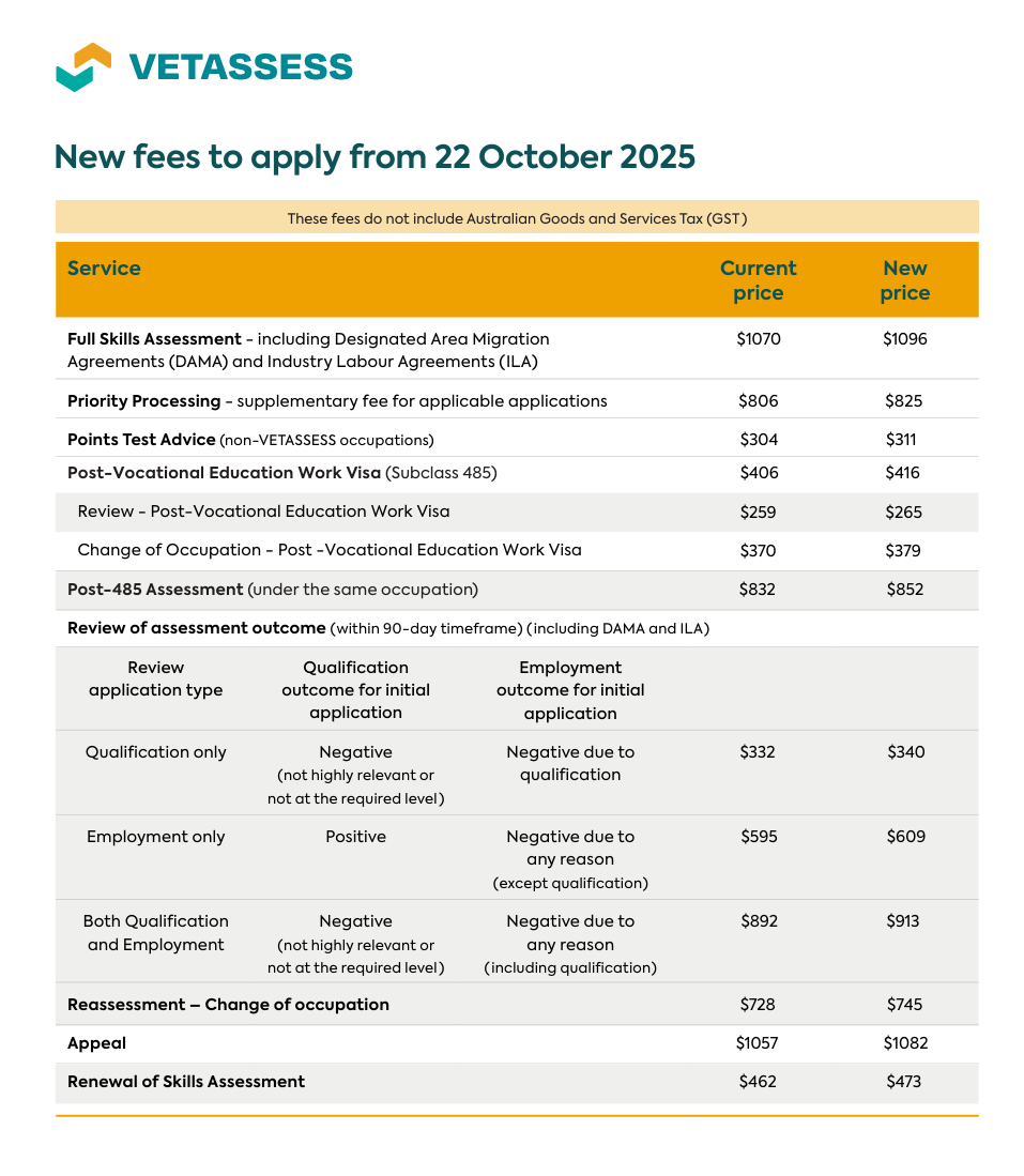 VETASSESS官方近日发布最新公告,自2025年10月22日起,将对部分职业评估服务的申请费用进行调整。